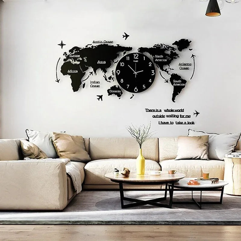 Large World Map DIY Wooden Wall Clock Quartz Watch
